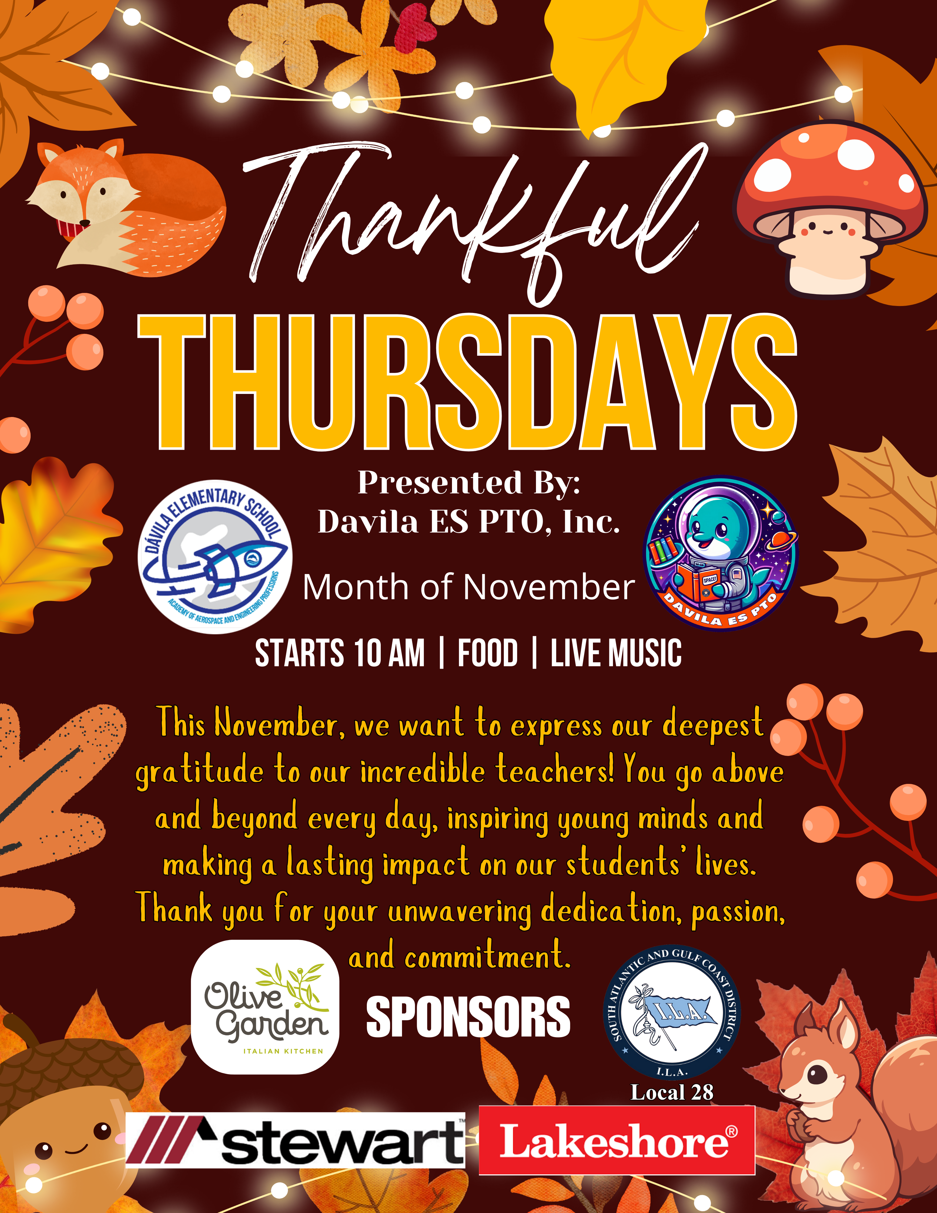 Thanks to generous sponsors, we were able to host our Thankful Thursdays program last year. Support like this makes it possible for Davila ES PTO, Inc. to continue funding events and initiatives that bring joy, strengthen community, and directly benefit our students and staff.